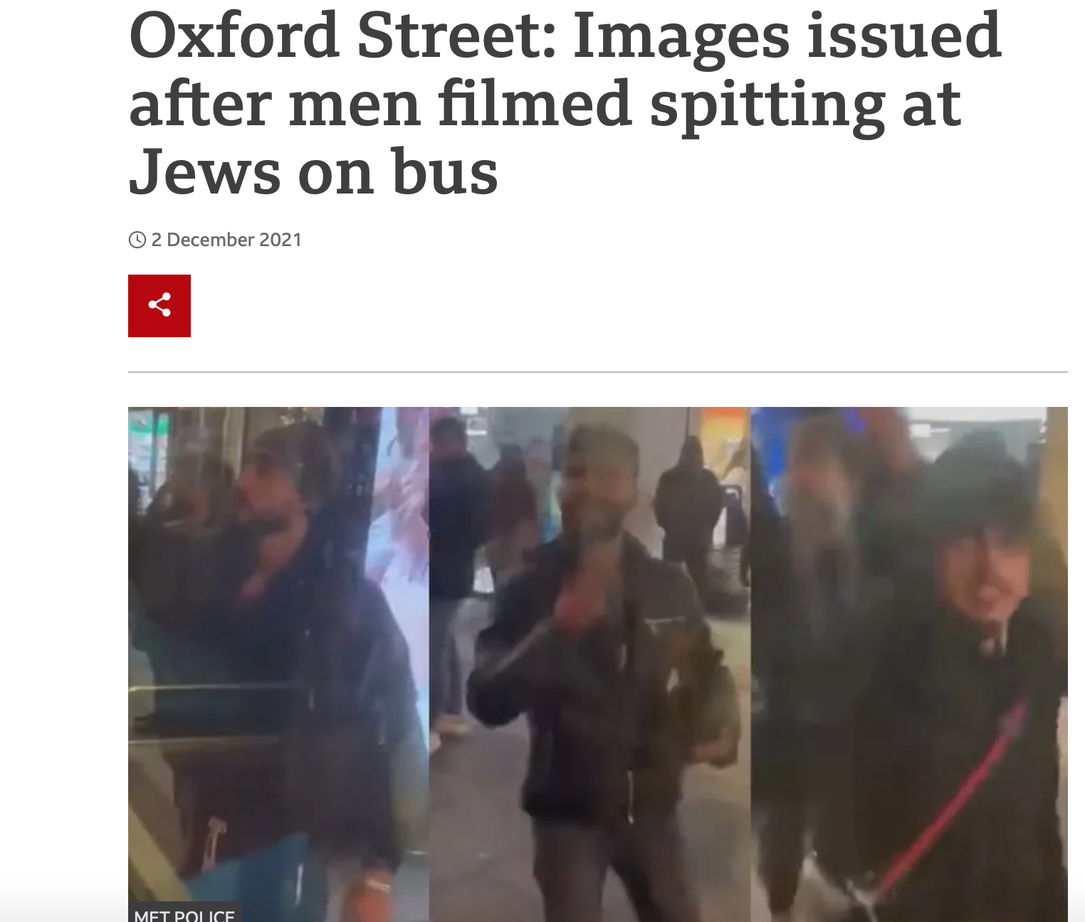 On 2 December 2021, the BBC news site published an article “Oxford Street: Images issued after men filmed spitting at Jews on the bus” with a video filmed in Oxford Street showing Jewish teenagers who were celebrating Hannukah being verbally attacked on a bus.